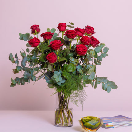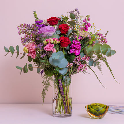 Our luxury pink & purple seasonal flowers, surrounded by large Naomi Red Roses.