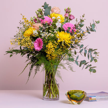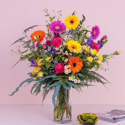 A deluxe, hand-tied bouquet with a mixture of brightly coloured, seasonal flowers.