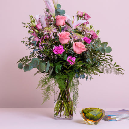A best-seller, this hand-tied bouquet is a mixture of the best pink flowers in season.