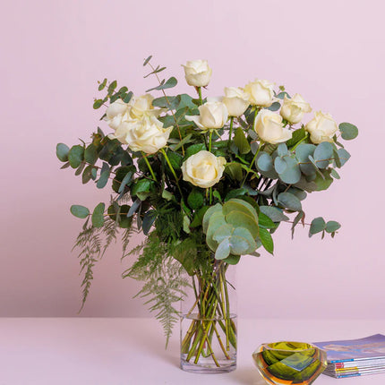 12 large-headed white Naomi Roses create an exquisite hand-tied bouquet.