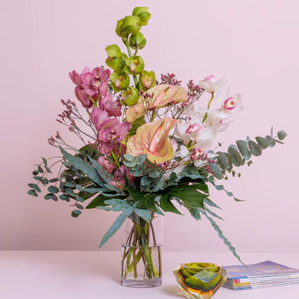 Cymbidium orchids take centre stage, surrounded by seasonal, exotic flowers.