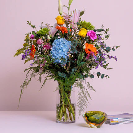 A deluxe, hand-tied bouquet with a mixture of brightly coloured, seasonal flowers surrounded by elegant greens.