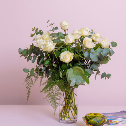 Hand-tied bouquet comprised of roses, lilies and seasonal white & green blooms.