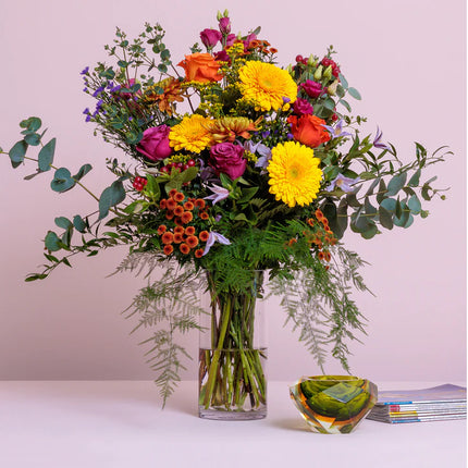 A deluxe, hand-tied bouquet with a mixture of brightly coloured, seasonal flowers.